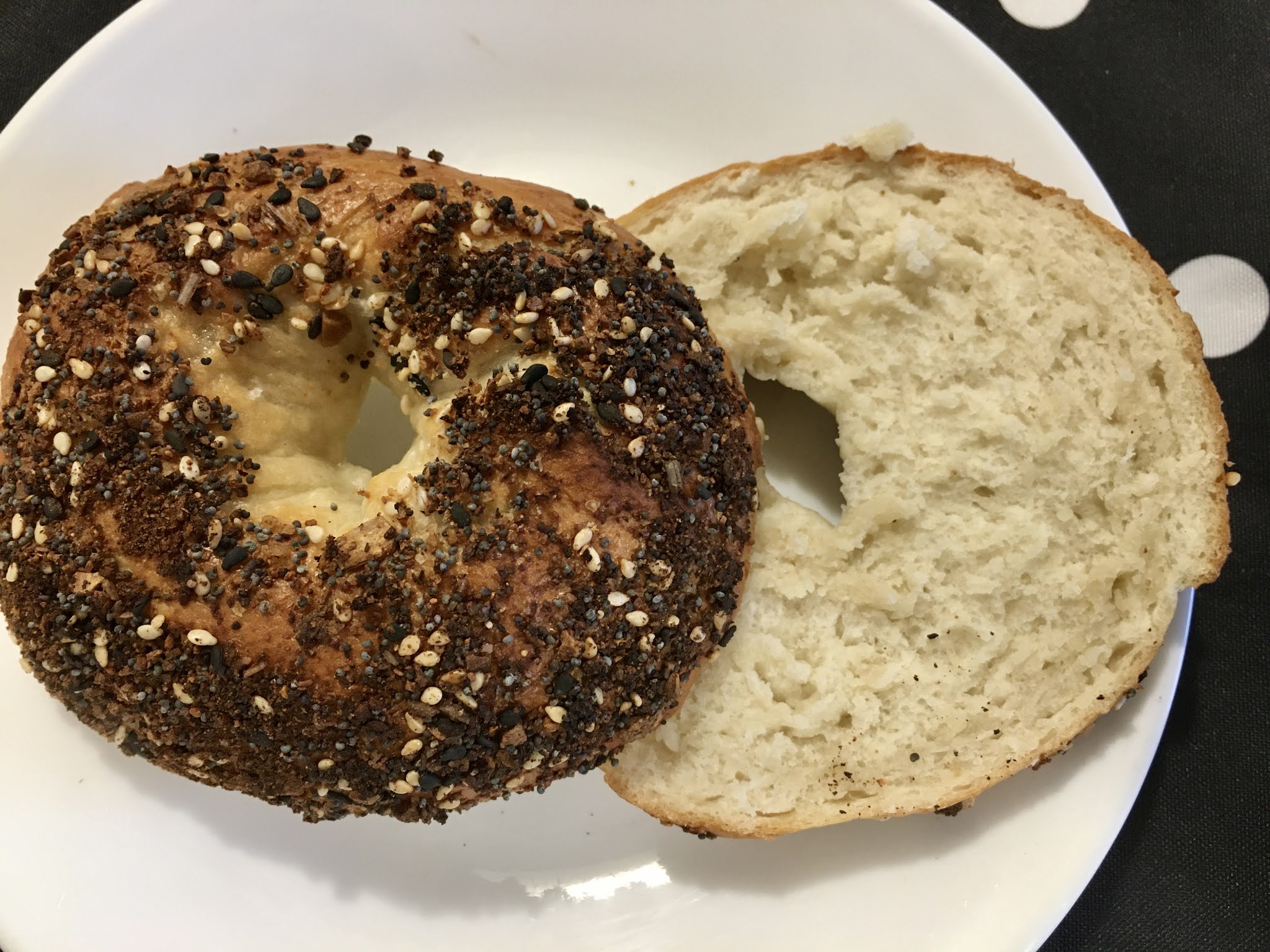 Voici de fort délicieux everything bagels, ou bagels tout garnis. À moins que vous ayez la chance d'avoir une bagelerie à proximité de chez vous, ils vous feront oublier ceux, souvent beaucoup trop mous, du commerce. Ceux-ci, à l'inverse, sont bien consistants, comme un bagel est censé l'être.