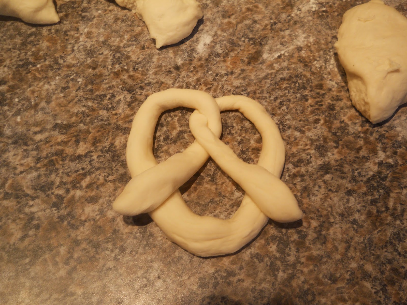 Mettre la pâte sur une surface de travail légèrement farinée et la coupée en 8 morceaux égaux. Prendre un des morceaux et le rouler contre le comptoir de manière à obtenir un ruban d'une longueur d'environ 50 cm (20 pouces). Croiser les deux extrémités de la corde formée vers le haut du plan de travail (voir figure 1 ci-bas). Les croiser une fois de plus pour former une torsade (voir figure 2), puis descendre la torsade vers le bas pour finalement former un bretzel (voir figure 3). Poser le bretzel sur une plaque à pâtisserie recouverte de papier parchemin. Répéter avec les 7 autres morceaux de pâte.